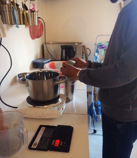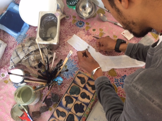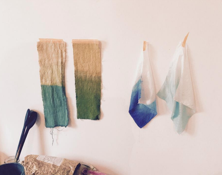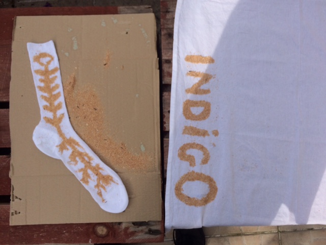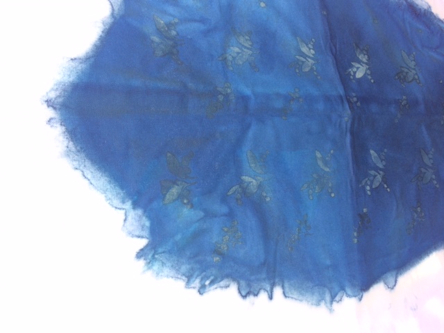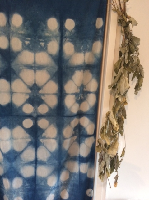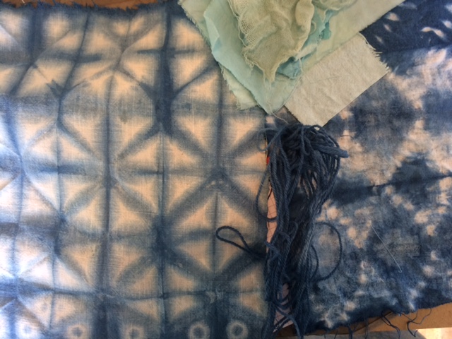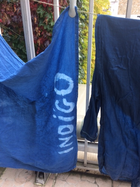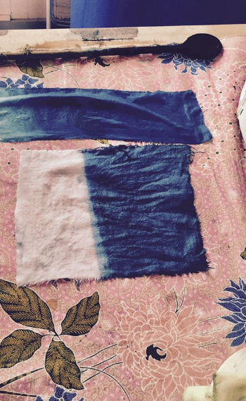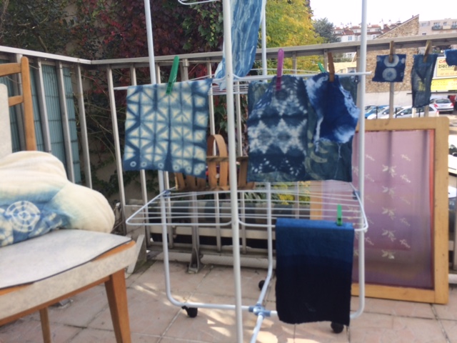 L'objectif du stage était de comprendre comment fonctionne l'indigo, la cuve, comment créer une couleur allant du bleu pâle au bleu soutenu, de créer des motifs par réserves (shiboris, pliages...) et par application de pâtes de réserve (argile et riz).